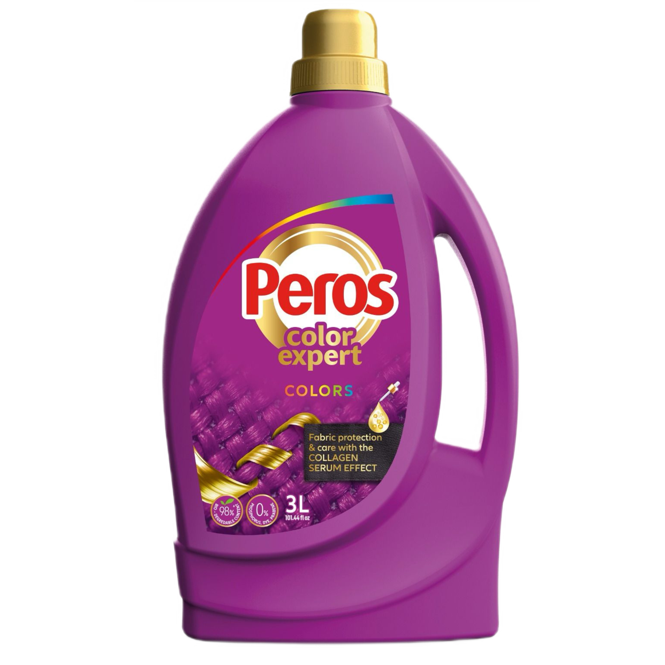 Miękkie, nasycone kolory bez blaknięcia. Peros Color Expert to skoncentrowany płyn do prania tkanin kolorowych, który delikatnie usuwa zabrudzenia i pomaga chronić włókna, aby Twoje ubrania dłużej wyglądały jak nowe.