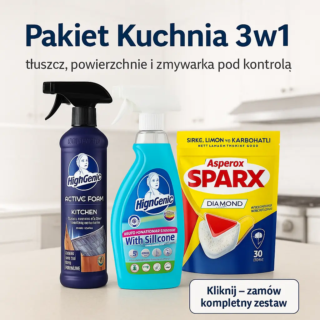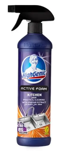 👉 HighGenic Active Foam Kitchen — aktywna pianka skutecznie rozpuszcza tłuszcz i przypalenia na kuchence, blatach i piekarniku.