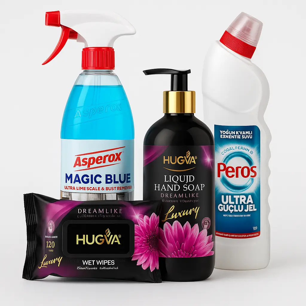 Gotowy pakiet „wszystko-w-jednym” do codziennego ogarniania mieszkania: mocny Asperox Magic Blue na kamień i rdzę, Peros Ultra Güçlü Jel do WC, luksusowe HUGVA Liquid Hand Soap Dreamlike do rąk oraz miękkie HUGVA Wet Wipes Dreamlike (120 szt.) do szybkich odświeżeń.